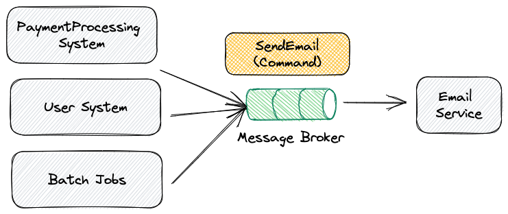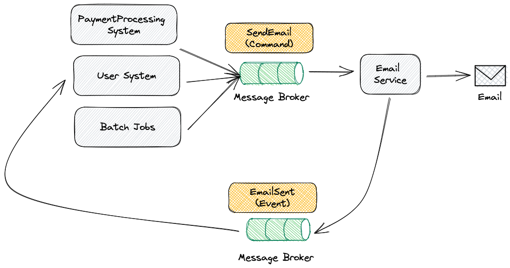 A word of warning though, if you have a good look at the previous diagram you’ll see that when any of the producers sends a message to the message broker it does not receive any kind of feedback from the Email Service.