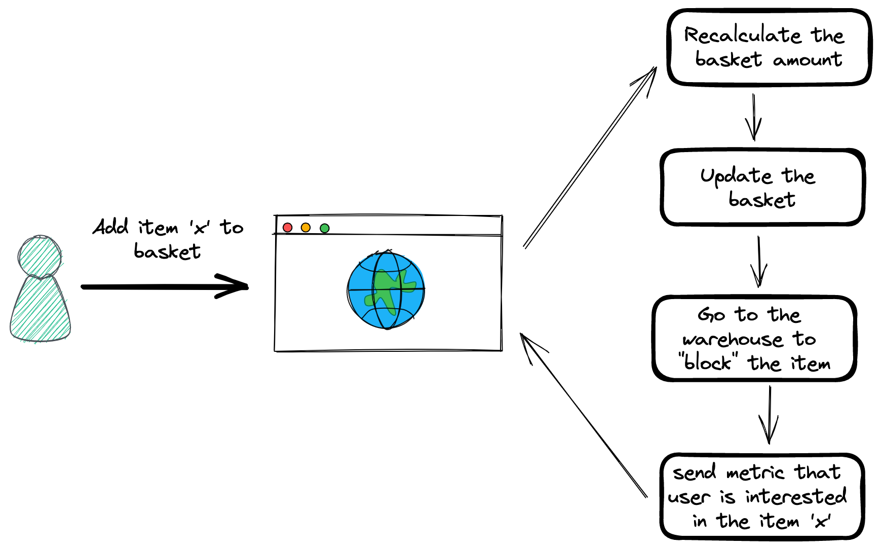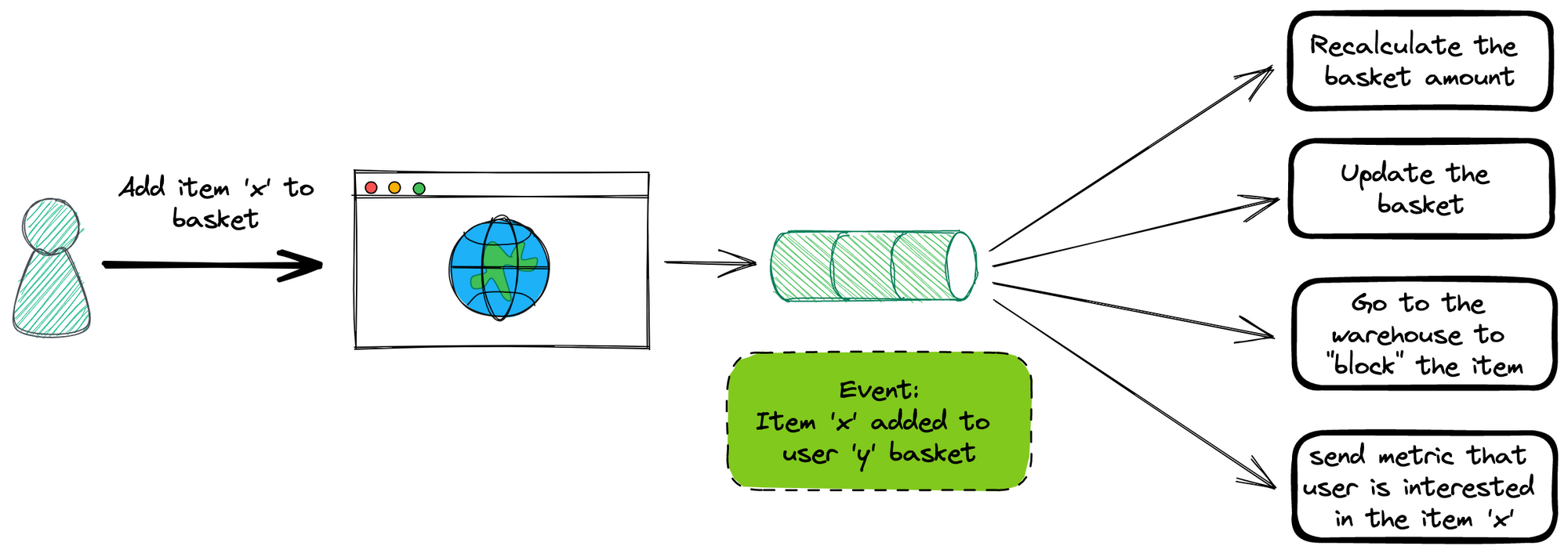 The main system will communicate that something happened, so the systems that are interested in that kind of event will react to it. When the system communicates the “item added to basket event”: