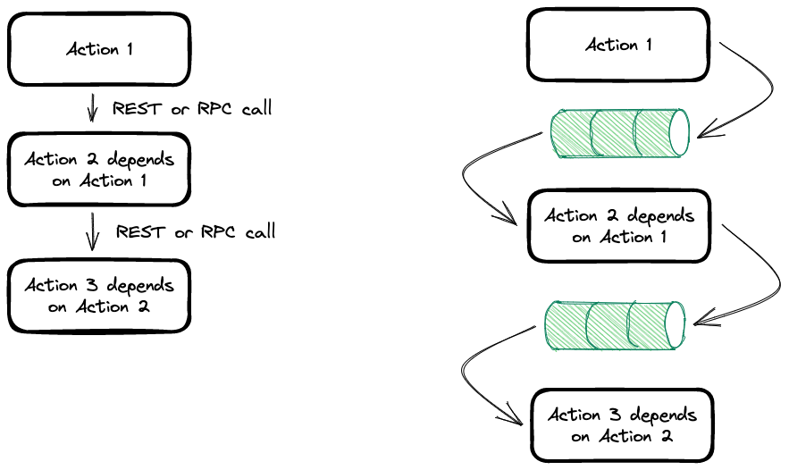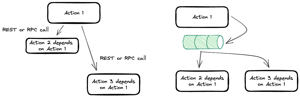 So, we have one system that needs to do lots of different things. Nowadays, in the microservices era, these different actions will be most likely performed by different systems, that might be online or offline, or have different processing speeds. What happens if one of them is down? or takes too long to respond? should the whole process wait for it?